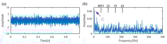 Figure 11 displays the raw vibration signal and its envelope spectrum. Owing to the heavy noise, the periodic defect impulses cannot be obviously observed from the time waveform, as shown in Figure 12a. Meanwhile, no significant BPFI or its harmonics are observed in the envelope spectrum, as shown in Figure 12b. To extract the weak fault feature from the raw vibration signal, DS-SVD is applied, and the corresponding denoized signal is illustrated in Figure 13. However, useful information related to the inner-race fault cannot be observed from the waveform of the denoized signal or its envelope spectrum. Moreover, it can be seen that the rotating frequency fr is dominant in the envelope spectrum, which illustrates that the DS-SVD method, which relies on an energy-oriented selection scheme, fails to effectively select the sensitive SCs containing diagnostic information when harmonic components dominate the signal.
