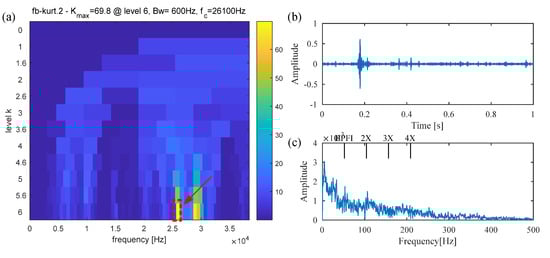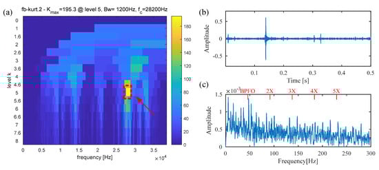 Spectral kurtosis (SK), a widely used and state-of-the-art method, is also adopted to extract the fault feature from the raw signal. Figure 14a presents the Kurtogram of the raw vibration signal, from which the resonance band with maximum spectral kurtosis (center frequency: 21,600 Hz; Bandwidth: 600 Hz) is easily determined. A band-pass filter with a center frequency of 21,600 Hz and a bandwidth of 600 Hz is designed to filter the vibration signal, and the filtered signal is displayed in Figure 14b. However, only several random impulses can be observed, and the periodic fault impulses are not detected. Similarly, the envelope spectrum in Figure 14c shows no obvious fault information. This failure results from the assumption that fault impulses occur in the frequency band with the largest kurtosis value. However, kurtosis is only a statistical indicator of signal sparsity, and the periodicity of the defect impulses is not taken into consideration. Therefore, it is susceptible to interference from non-Gaussian signals and random noise.