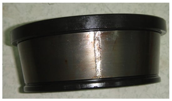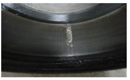Figure 18 presents the time waveform of the raw vibration signal and its envelope spectrum, from which no periodic fault impulses or fault characteristic frequency can be observed. Then the DS-SVD is performed on the vibration signal, and the results are displayed in Figure 19. Similar to Experiment 1, it can be seen that the rotating frequency and its multipliers are dominant in the envelope spectrum, while the BPFO and its harmonics are not prominent, which implies that the suitable SCs with abundant information are not identified. Figure 20a shows the Kurtogram of the signal, where the resonance band is determined to be at the center frequency of 282,000 Hz with a bandwidth of 1200 Hz. The filtered signal obtained through the corresponding band-pass filter is presented in Figure 20b, where only random shocks are extracted. Moreover, there is no obvious fault characteristic frequency or its multiplier in the envelope spectrum. Finally, the proposed FDMK-SVD is applied to the same signal, and the results are shown in Figure 21 and Figure 22. According to Figure 21, it can be seen that the FDMK of several SCs exceeds the threshold line, which implies that these SCs may contain useful diagnostic information. To validate the above analysis, a reweighting scheme is adopted, and the reconstructed signal is shown in Figure 22. Periodic fault impulses are effectively extracted, which verifies the effectiveness of FDMK-SVD in extracting weak fault features and suppressing noise interference. Moreover, the BPFO and its harmonics are obvious in the envelope spectrum, which indicates that the outer race of the rolling bearing is faulty. Then the locomotive bearing is disassembled, from which the outer-race fault of the bearing is clearly recognized, and the picture is illustrated in Figure 23.