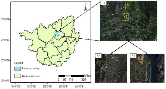 Liucheng County, belonging to Liuzhou City, Guangxi Zhuang Autonomous Region, is located in the north-central part of the Guangxi Zhuang Autonomous Region, between longitude 108°36′ E and 108°50′ E and latitude 24°26′ N and 24°25′ N. It is adjacent to Luzhai County in the east, borders Luocheng Mulao Autonomous County and Yizhou District in the west, connects with Liuzhou City Suburb and Liujiang District in the south, and borders Rong’an County and Rongshui County in the north. The maximum horizontal distance between the east and west of the county is 79 km, and the maximum vertical distance between the north and south is 47 km. The total area covers 2114.37 square kilometers. The Liucheng County area belongs to the subtropical monsoon zone, with hot summers and cold winters, four distinct seasons, and abundant light energy and water. The forest cover is wide, and it is very suitable for sugarcane crop cultivation. Therefore, this experiment chooses the Liucheng County area for the study to carry out the following experiments. The specific image is shown in Figure 1.