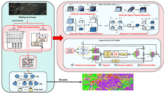Aiming at the problem that traditional deep learning algorithms cannot make full use of contextual information in multispectral remote sensing images, this paper proposes the MLPRNN vegetation cover classification algorithm fusing LSK and ODC, called LO-MLPRNN. As shown in Figure 2, the structure mainly consists of an ODC, LSK module, multilayer perceptron (MLP), and GRU. Firstly, the ODC module is used to generate dynamic convolutional features, and the local and global feature representations are further enhanced by the LSK module, which uses multi-scale convolutional operations to capture spatial information under different perceptual fields and integrates the multi-scale features through a specific weighting mechanism to enhance the representational capability. Subsequently, the parallel features generated by the ODC and LSK modules are fused, and the fused features are reorganized into a feature format suitable for RNN input through dimensional transformation. The RNN module performs temporal modeling on the reshaped spectral features to generate hidden layer features that are more expressive of the spectral sequence. The features extracted by the GRU are further mapped to the high-dimensional feature space through a fully connected layer, followed by an activation function to enhance the nonlinear properties, and finally by a classification layer to achieve a fine-grained multispectral image. Finally, the classification layer is used to achieve the refined vegetation classification of multispectral images.