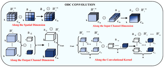 denotes a kernel smart multiplication operation along the kernel dimension of the convolution kernel space, assigning an attention scalar to the whole convolution kernel; denotes a channel smart multiplication operation along the output channel dimension, assigning different attention scalars to the output convolution; denotes a filter smart multiplication operation along the input channel dimension, assigning a different attention scalar to each of the convolutions; and denotes a positional smart multiplication operation along the spatial dimension, assigning different attention scalars to convolution parameters at the k × k spatial locations. As shown in Figure 3, redrawn based on article [41], in principle, these four types of attention are complementary to each other and progressively multiply them by the convolution kernel in the order of positions, channels, filters, and kernels, such that the convolution operates on all spatial positions of the input image spectral sequences, all input channels, and all kernels. With ODConv’s multi-dimensional attention, the importance of different bands and spatial locations can be automatically learned, highlighting the features that are critical for classification, fully exploiting the need for spectral–spatial features of remotely sensed images to match, and providing performance guarantees for capturing rich contextual cues of remotely sensed images.