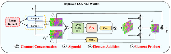 In order to better handle the contextual information required for vegetation cover classification in remote sensing images, LSK was chosen to be used to connect with ODC in parallel. The large kernel convolution and spatial kernel selection mechanisms of LSK have already taken spatial contextual information into account to a certain extent [42]. The LSK module is a feature enhancement module that combines convolution operations with multi-head attention to further improve the efficiency of spatial feature extraction. It uses two convolutional layers to extract features from the input. This module uses convolutional layers to fuse attention weighted features with the original features. By incorporating a multi-head attention mechanism, the attention weights for feature extraction can be calculated, further enhancing the modeling of contextual information. This allows the model to focus on the most relevant spatial regions. This mechanism mainly reduces and restores the dimensionality of input features by flattening them and passing them through fully connected layers. Its network structure is shown in Figure 4.