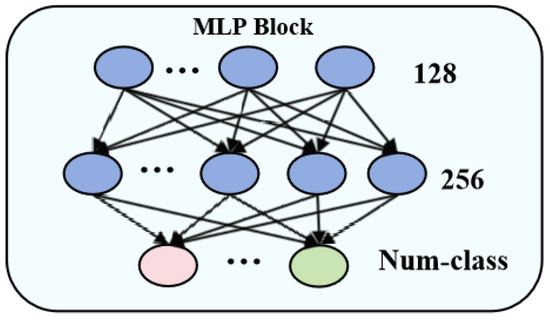 MLP is a neural network design that consists of an input layer, numerous hidden layers, and an output layer, allowing it to successfully process nonlinear data and adapt to complex data distributions. This model exhibits considerable flexibility and demonstrates strong performance across various tasks, as it does not impose limitations on the relationships among features. The MLP’s capacity to manage nonlinear data without constraining feature relationships, along with its adaptability to complex data distributions, underscores its versatility and efficacy in diverse applications. The specific architecture of the MLP utilized in this study is illustrated in Figure 6. The input layer features a dimensionality of 128, which is expanded to 256 in the hidden layer, while the output layer corresponds to the number of classifications. Notably, the MLP employed in this research implements the ReLU activation function, thereby mitigating the gradient vanishing problem that can arise with traditional sigmoid activation functions during backpropagation.