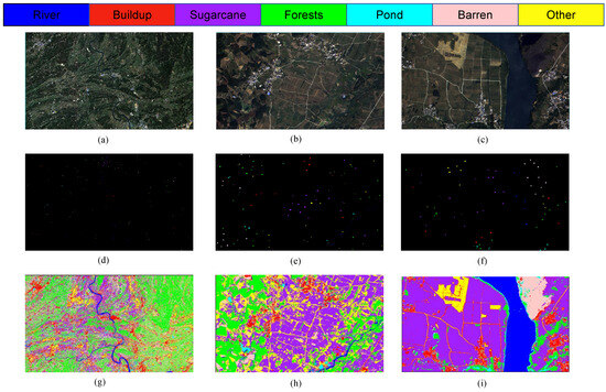 Comparison of ground truth values: (a) S1 study area original image; (b) S2 study area original image; (c) S3 study area original image; (d) S1 ground truth value; (e) S2 ground truth value; (f) S3 ground truth value; (g) S2 study area classification image; (h) S2 study area classification image; (i) S3 study area classification image.