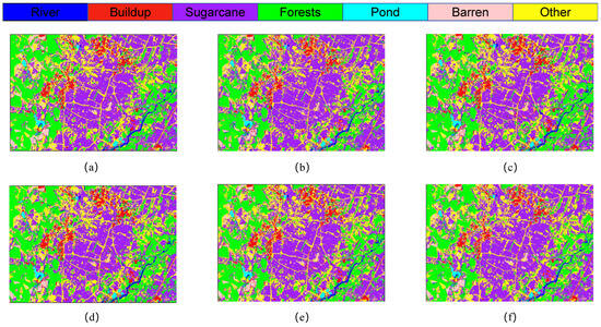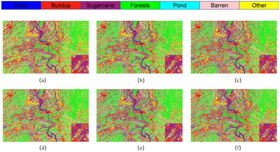 Classification results of LO-MLPRNN using different module combinations for the S1 study area dataset. (a) MLPRNN. (b) LO-MLPRNN (odc). (c) LO-MLPRNN (lsk). (d) LO-MLPRNN (improved lsk). (e) LO-MLPRNN (odc+lsk). (f) LO-MLPRNN (odc+improved lsk).