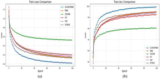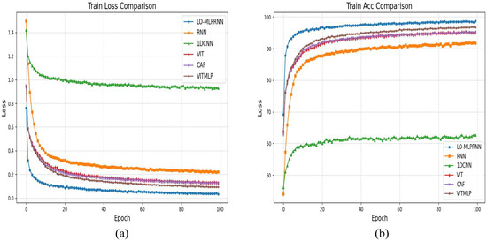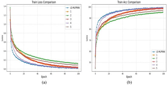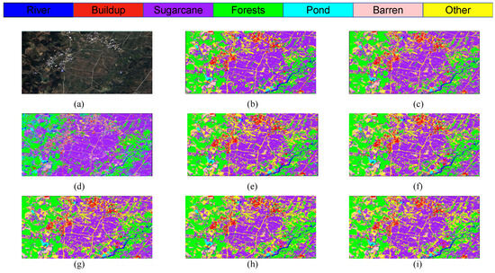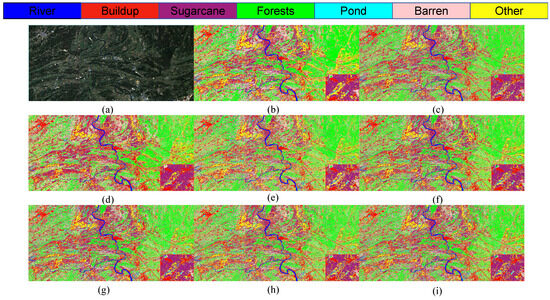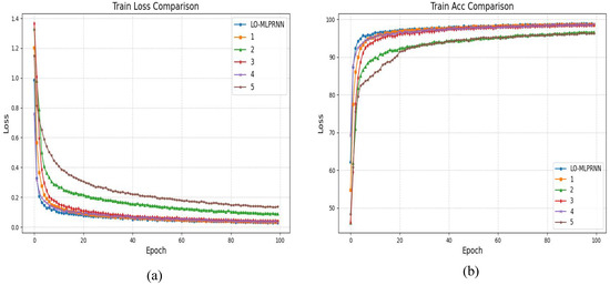 Figure 8 presents the classification outcomes for various combinations of module pairs applied to the GF-2 study area dataset, which includes categories such as forests, sugarcane, and barren land. Comparing Figure 8a, it is observed that the inclusion of the ODC module alongside the LSK module enhances the accuracy of sugarcane classification. However, when the LSK and ODC modules are integrated in parallel, the classification results depicted in plots Figure 8c,d do not achieve the same level of accuracy in identifying built-up areas as plot Figure 8e. Notably, the comprehensive LO-MLPRNN model demonstrates superior discriminative capabilities compared to any other module combination. The primary challenge in classifying this region arises from the overlap between barren land and sugarcane; nevertheless, the complete LO-MLPRNN model exhibits the most effective performance, characterized by significant denoising capabilities. The changes in loss function and accuracy with the number of iterations during the training process are shown in Figure 9.