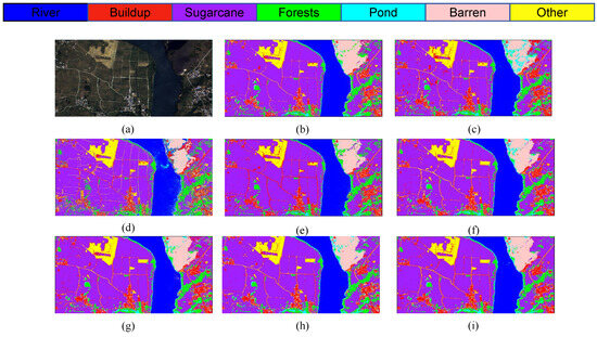 The experimental findings pertaining to the Sentinel-2 dataset are presented in Table 3. Following the expansion of both the study area and the number of spectral bands, the overall accuracy (OA)of the MLPRNN was recorded at 92.93%. This result suggests that an increase in the number of bands necessitates a more intricate model architecture to effectively manage the data, as there exists a notable correlation among the 12-band dataset that may hinder the simple model’s ability to extract and learn essential features. As additional modules are incorporated, there is a corresponding enhancement in accuracy. Notably, the accuracy of the MLPRNN when integrated with multi-head attention exhibits a substantial improvement, achieving an OA of 98.62%, an average accuracy (AA) of 98.63%, and a Kappa coefficient of 98.39%. This underscores the advantages of employing multi-head attention in the classification of multi-band remote sensing imagery. Ultimately, after the integration of all modules, the OA reached 99.43%, reflecting a 6.4% increase compared to the baseline MLPRNN, with both AA and Kappa also demonstrating significant improvements.