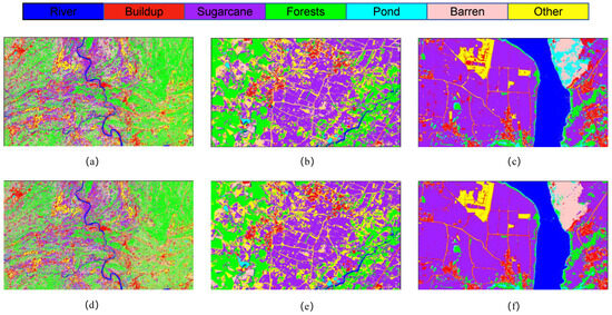 Comparison of classification results between KAN and LO-MLPRNN in three study areas: (a) KAN in S1. (b) KAN in S2. (c) KAN in S3. (d) LO-MLPRNN in S1. (e) LO-MLPRNN in S2. (f) LO-MLPRNN in S3.