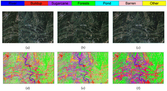 True-color maps of three-phase images: (a) 2019, (b) 2021, and (c) 2023; spatial distribution of features in three-phase images: (d) 2019, (e) 2021, and (f) 2023.