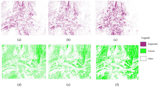 Spatial distribution of sugarcane: (a) 2019, (b) 2021, and (c) 2023 in the three-phase image; spatial distribution of forests: (d) 2019, (e) 2021, and (f) 2023 in the three-phase image.