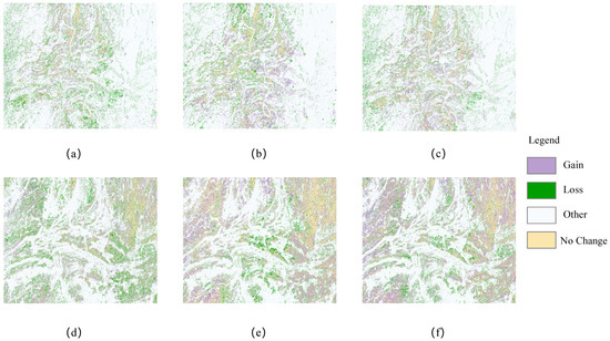 Dynamics of suagrcane in 2019–2021 (a), 2021–2023 (b), and 2019–2023 (c); dynamics of forest in 2019–2023 (d), 2021–2023 (e), and 2019–2023 (f).