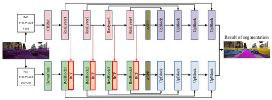 Since images and point clouds are different modality data, it is difficult for a single network to handle the feature information of both modalities. Inspired by related methods [40,48], we propose a cross-modal fusion-based point cloud segmentation network (CMFNet). The specific structure is shown in Figure 1. The network contains a two-stream feature extractor that processes images from cameras and point clouds from LiDAR, respectively; a cross-modal attention fusion (RCF) module that is used to realize the complementary strengths of image and point cloud features; and a pair of up-sampling modules with cross-layer connectivity, which can gradually restore the high-dimensional feature maps to the size of the input dimensions, respectively.