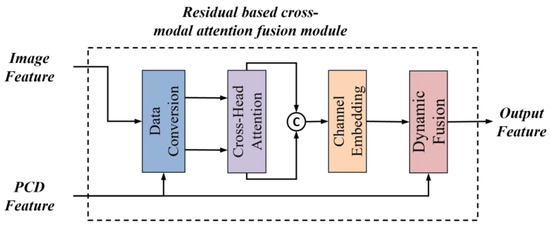 Since the image features contain details of many objects in the scene and the point cloud features retain more spatial geometric features, we designed a residual fusion module based on cross-modal attention, as shown in Figure 2. The module consists of four submodules: data conversion, the crosspath module, channel embedding, and dynamic fusion. Data conversion projects the features onto a suitable representation space, the crosspath module is responsible for integrating different inputs, the channel embedding submodule is used for in-depth feature extraction, and dynamic fusion is responsible for fusing various types of features. The overall process aims to generate features with higher expressive power that can be used for subsequent tasks, such as classification, target detection, or semantic segmentation. The structure of this module allows the model to better understand the relationships between different data sources when dealing with multimodal data.