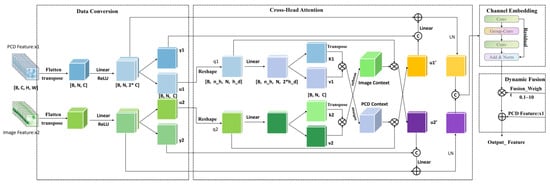 Data conversion consists of two identical channel projection modules that process the input point cloud features and image features , respectively, as shown in Figure 3. The purpose of channel projection is to project the original channel dimensional features onto a lower dimensional space in order to reduce the computational complexity and enhance inter-channel correlation. The cross-attention submodule is used to perform a cross-attention operation between the projected features, and , so that they can “focus” on each other and obtain information about each other. The key steps in the cross-attention computation are as follows: First, we project u1 and u2 into queries (q) and keys/values (k, v) through linear transformations. Subsequently, the attention mechanism computes the weights between each query and its corresponding keys, enabling targeted information aggregation.