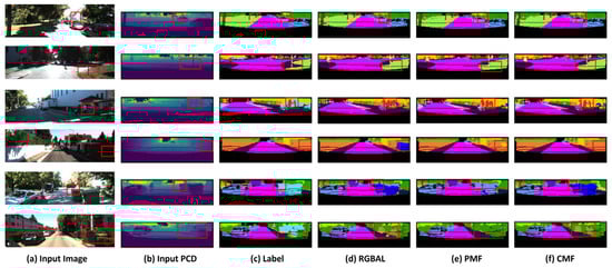 In order to demonstrate the superiority of the CMF’s segmentation accuracy more intuitively, we visualized the prediction results of the CMF, RGBAL and PMF based on the SemanticKITTI dataset, and used red rectangles to mark the contrasting regions. From Figure 4, we can observe that the CMF framework has a superior segmentation effect at the edge of the object; comparing the fourth row, when the rider is riding a bicycle, the CMF is able to accurately segment the rider and the bicycle compared to RGBAL and PMF. When comparing Figure 4c,e, the cars, traffic signs, and roads, etc., segmented using the CMF have more complete shapes, and the overall scene segmentation effect is more significant. Meanwhile, when comparing Figure 4d,e, the CMF outperforms the PMF in regard to the segmentation of long-distance targets. Therefore, the CMF framework shows better segmentation performance compared to RGBAL and PMF in regard to long distance, interference areas, and small targets.