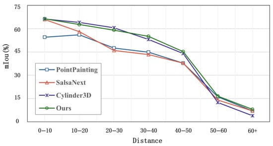 In order to evaluate the importance of long-range sensing for autonomous driving safety, we conduct a distance-based evaluation experiment. As shown in Figure 5, the segmentation accuracy of the CMF framework is slightly lower than that of Cylinder3D when the distance is less than 35 m. However, the segmentation accuracy of the CMF framework exceeds that of Cylinder3D when the distance is greater than 35 m.