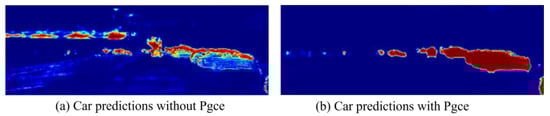 Comparison of prediction results. Networks trained with and without perceptual guided cross-loss function are compared; Pgce denotes perceptual guided cross-loss function. For clarity, only the car-related predictions are shown in red. In the picture, the redder the area is, the greater the possibility that it is predicted to be a car.