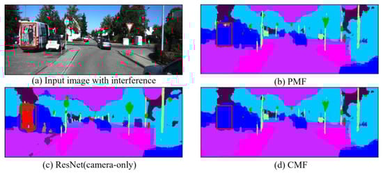 When fusing image features, the model is susceptible to information interference, and in order to investigate the robustness of the CMF framework in regard to interfering samples, we insert additional targets into the image (e.g., the poster of the people on the back of the vehicle in Figure 7), while keeping the point clouds unchanged. In addition, based on the SemanticKITTI dataset, we implement a camera stream-only method, ResNet, and a camera and LiDAR fusion method, PMF to predict the results. Note that we do not use any adversarial training techniques during the training process.