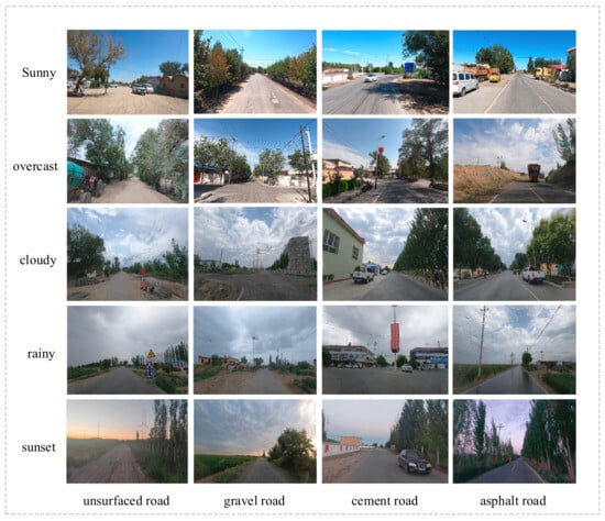 This study aims to establish a data foundation for smart agricultural machinery technology in agricultural production bases. The data collection area is set in typical scenarios such as rural areas, fields, and urban–rural roads. The data collection work systematically covers various typical road types, including asphalt roads, cement roads, gravel roads, and dirt roads, based on the temporal and spatial characteristics of agricultural machinery operations. Special emphasis is placed on two representative time periods for image collection: daytime (with sufficient lighting) and dusk (with changing lighting conditions). The object categories for image recognition mainly include dynamic objects (such as agricultural machinery vehicles, cars, trucks, tricycles, bicycles, pedestrians, and livestock) and static objects (such as trees, traffic signs, streetlights, fences, walls, and other infrastructure).