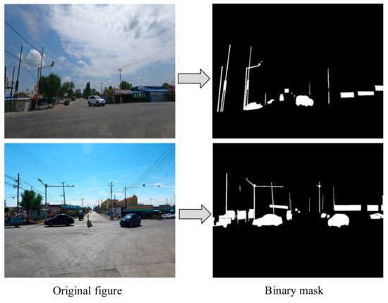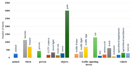 In this study, the Computer Vision Annotation Tool (Intel Corporation, Santa Clara, CA, USA) was employed to set up a multi-user online image annotation platform on a local server. The polygon annotation tool was utilized to perform pixel-level fine-grained annotation on all images. The dataset constructed in this study contains 39 categories, 20 of which have instance segmentation annotations. The categories of instances can be grouped into six broad categories, which are as follows: animal (animal), block (barrier and banner), person (person), objects (CCTV camera, street light, trash can, tower, and pole), traffic signaling device (traffic frame, traffic light, and traffic sign), and vehicle (car, bus, motorcycle, truck, rickshaw, agricultural implements, agricultural machinery, and tricycle). The other 19 classes (such as vegetation, sky, building, etc.) are semantic segmentation categories, and related research will be carried out in another paper. The 20 categories listed in this paper only cover the instance segmentation part, which is mainly used to evaluate the compatibility of the segmentation performance of synthetic images at the object level with real images to support the modeling requirements of subsequent obstacle avoidance tasks.
