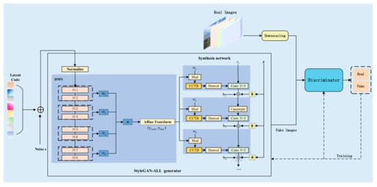 The exceptional performance of generative adversarial networks (GANs) in image generation tasks primarily relies on the powerful nonlinear fitting capabilities of neural networks. Consequently, the quality and diversity of generated images are directly influenced by the design of the network architecture [21]. To solve the problem of limited dataset scale in this study and provide richer data samples for the training of subsequent instance segmentation models, an improved model, StyleGAN-ALL, based on StyleGAN2-ADA, is proposed in this study, and the basic structure of the network is shown in Figure 4. This model further optimizes the quality and diversity of generated images by introducing the decoupled mapping network (DMN) and the convolutional coupling transfer block (CCTB). Specifically, the decoupled mapping network reduces the coupling degree of latent space encoding, and the CCTB module enhances the model’s ability to capture complex context information by combining the advantages of convolutional neural networks (CNNs) and transformers.