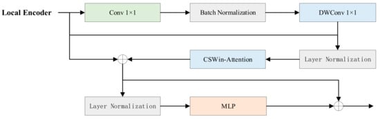 The module is primarily divided into five components: a local encoding module (LEM), a cross-shaped window self-attention (CSWin-Attention), a batch normalization (BN), a layer normalization (LN), and a multilayer perceptron (MLP). Its structure is illustrated in Figure 5. The computational process of the CCTB module is as follows: