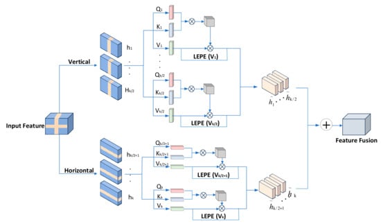 where and are the outputs of vertical attention and horizontal attention, respectively, which are obtained by globally aggregating the local self-attention results . is the learnable fusion weight, initialized with a value of 0.5 and automatically optimized by backpropagation, which is used to balance the contributions of vertical and horizontal attention in the final output. In addition, the fusion method of Formula (13) can have an indirect effect on the diagonal direction. When the weights and take different proportions, they form feature combinations of different directions in the feature space. For example, when is 0.6 and is 0.4, then the synthesis direction and diagonal direction , so it has a certain diagonal information capture ability.