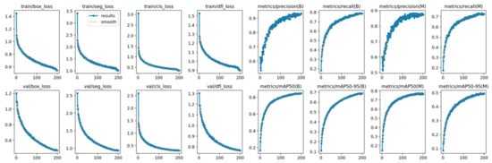 Figure 7 shows the trends of the loss functions and evaluation metrics during the model’s training process. As shown in the figure, during the initial training phase (the first 50 epochs), the loss functions (trainbox_loss and valbox_loss) decrease rapidly, while the evaluation metrics (metrics/precision(B), metrics/recall(B), and metrics/mAP50(B)) increase significantly. This indicates that the model can quickly learn features from the data and improve performance in the early stages. However, after 50 epochs, the changes in the loss functions and evaluation metrics gradually stabilize, entering a plateau. Finally, both the loss functions and evaluation metrics reach convergence, indicating that the model has learned a relatively stable solution on the training data.