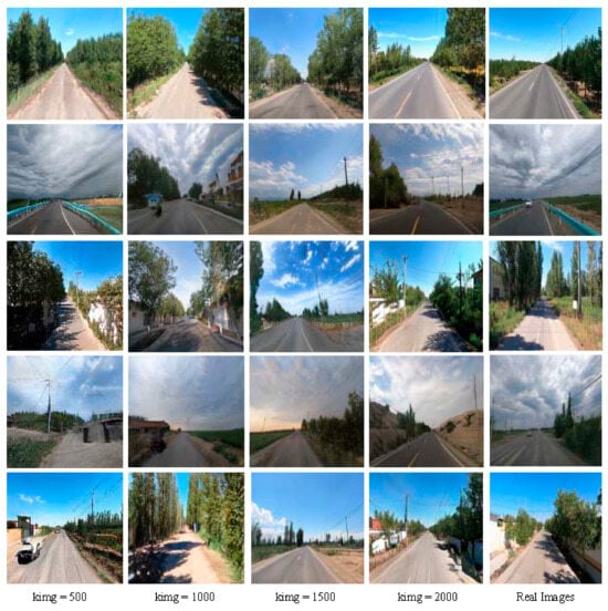 In order to comprehensively show the generation effect of the rural road scene in different iteration stages, Figure 8 shows where kimg represents the number of iteration cycles of model training. When kimg is 500, the generated images show obvious distortion problems: distorted road shapes, unclear boundaries between trees and sky, and blurred vehicle shapes, showing that the algorithm is still in the early stage of optimization. As training progresses to kimg 1000, significant improvements are observed: unnatural distortions in the road are greatly reduced, lane markings on the road surface become distinct, although vegetation details along the roadside remain slightly blurred, and the boundary between trees and the sky requires further refinement. This indicates that the generation quality is steadily improving. At kimg 1500, the realism of the images improves significantly: the boundary between the sky and trees becomes clearly distinguishable, details such as utility poles are finely rendered, and the diversity of environmental elements increases notably, reflecting the generative model’s enhanced ability to handle complex scenes. Finally, when iterating to kimg 2000, the generated rural road image is almost realistic; not only are the details of the road and the surrounding environment highly restored, but also the roadside buildings are constructed. This process not only shows the trajectory of the improved StyleGAN-ALL model gradually overcoming distortion and improving generation quality through iterative training but also highlights its excellent potential for image synthesis of complex scenes.