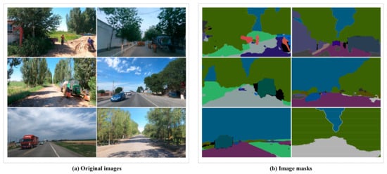 With the rapid advancement of autonomous driving technology, the application of agricultural machinery autonomous driving systems in rural road environments has become increasingly important. Machine vision and autonomous navigation [1,2] technologies have emerged as focal points of research. Deep learning [3], owing to its high precision, strong robustness, and relatively low cost, has made significant strides in the field of autonomous driving. However, the effective training and superior performance of instance segmentation models largely depend on datasets that are abundant in samples and evenly distributed. Currently, most existing road instance segmentation datasets, such as Cityscapes, BDD100k, and Mapillary Vistas, primarily focus on urban road scenarios [4,5], with relatively less coverage of rural roads, unstructured road sections, and special environments like farmlands and woodlands. These existing datasets fall short of meeting the needs of rural road autonomous driving systems for training instance segmentation models. Therefore, constructing a high-quality dataset that comprehensively covers the characteristics of rural roads is not only crucial for enabling intelligent agricultural machinery to achieve autonomous navigation, precise obstacle avoidance, and safe operation, but also provides a solid data foundation for advancing the intelligent construction of rural areas.