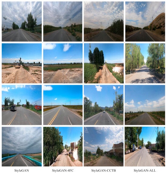 In this ablation experiment, we aim to explore the influence of the decoupled mapping network and the CCTB module on the performance of the StyleGAN2-ADA network in generating rural road scene images. In this paper, StyleGAN2-ADA is used as the baseline model, and four variant models with different configurations are constructed:
