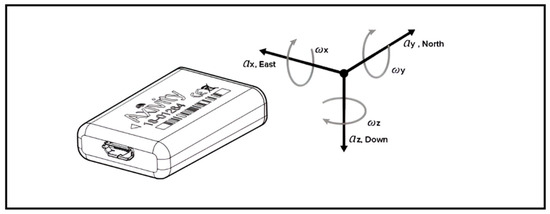 The AX6 captures motion data along three axes: horizontal right–left (X), vertical (Y), and horizontal front–back axis (Z), using a solid-state triaxial accelerometer (Figure 1).