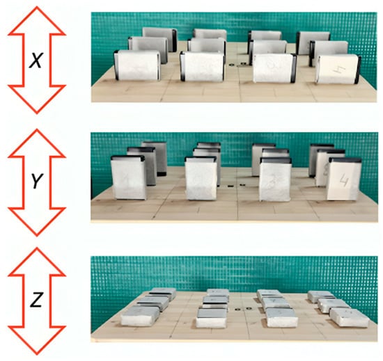 Placement of the accelerometers on the vibration platform to be shaken vertically in the X, Y, and Z axes. The arrow indicates the direction of motion.
