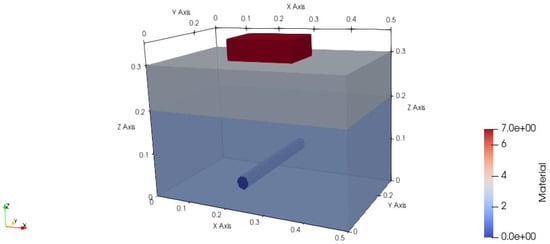 In the equation, is the relative permittivity at infinite frequency, is the relative permittivity at zero frequency, is the relaxation time, is the conductivity, is the angular frequency, , and is the permittivity of free space. Due to the complex geometric structure of the detection scene, the same model with unified parameters was constructed in the GPRMAX (v3.1.7) software based on the FDTD principle, and the simulated time-domain waveform was compared and analyzed. This method can not only reduce the error caused by model differences, but also improve the reliability of the results, and further verify the results of FDTD.
