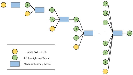 The nested loop neural architecture proposed in this paper consisted of two independent network architectures. For the first network architecture, the first step was to input a vector composed of model parameters, including moisture content (WC), radius (R), and depth (D), in order to predict the first principal component. Then, the model parameters were combined with the first predicted principal component to predict the second principal component. The causal relationship between these principal components not only constrains the range of the prediction results but also effectively reduces the optimization search space, enhancing both computational efficiency and model performance. The second step involved using the model parameters along with the previously predicted principal components (the first and second principal components) to predict the third principal component. This process continued until all forty principal components were predicted. It is important to note that each stage was independently trained, effectively avoiding the common issues of gradient vanishing and overfitting in deep architectures, ensuring the stability and reliability of the model. At each stage, the data were re-divided into training, validation, and test sets, a strategy that ensured the generalization ability of the neural network, prevented over-reliance on a specific dataset, and improved the model’s adaptability and robustness. Figure 2 shows the network structure and learning strategy of the first part, forming a deep learning system consisting of 40 layers.