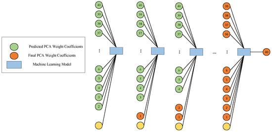 However, due to the inherent uncertainty in the prediction process, these coefficients inevitably exhibit a certain degree of bias. To address this issue, a subsequent module was designed and introduced, with the core goal of establishing the causal relationship between the error of the predicted values relative to the actual axis and the model parameters, with a particular focus on the analysis of the differences between the predicted values and the actual axis. For the second network architecture, the first step was to combine the model parameters with all the principal components except the first predicted principal component to predict the corrected first principal component. The second step involved using the model parameters along with the corrected first principal component and all the principal components except the second to predict the corrected second principal component. This structure was iteratively executed until all components were fully corrected, forming a complete and corrected set of principal components. Figure 3 visually illustrates the second part of the architecture, closely integrating with the first part of the network architecture.