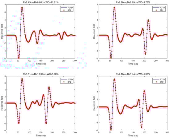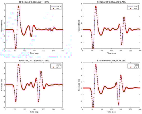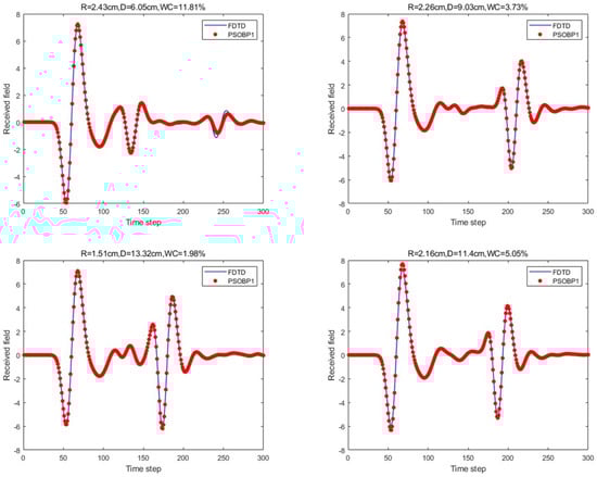 Under the four model parameters, the prediction results of the proposed method (PSO-optimized single hidden layer) are compared with those of FDTD.