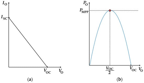 According to Equations (13) and (14), IO has a linear relationship to VO, while PO has a quadratic relationship to VO, as graphically represented in Figure 5a and Figure 5b, respectively.