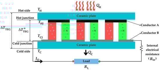 In the topology in Figure 2, thermal energy flows from a heat source to the hot side of the TEG, while the cold side releases the heat to the surroundings. The heat flow rates QH and QC, due to thermal conduction, which flow, respectively, from the heat source to the hot junction through the upper ceramic plate and from the cold junction to the surrounding environment through the lower ceramic plate, can be expressed as follows [41]:
