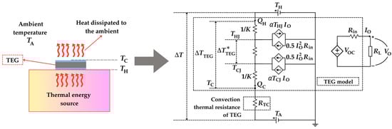 Based on the phenomena formulated in Equations (1)–(8), an equivalent electrical model can be developed, as shown in Figure 4 [41,44,45]. Heat flow rate, temperature, and thermal conductance are represented by analogous electrical quantities: current, voltage, and conductance, respectively. The upper voltage source represents the temperature (TH) at the hot side, while the lower voltage source models the temperature (TC) at the cold side. The current-dependent current sources describe the contribution of the Joule effect and the Peltier effect to the heat rate at the hot/cold junctions. The right side in Figure 4 represents the electrical output of the thermocouple that is modelled as an equivalent Thevenin circuit, with VOC in series with Rin connected to the load (RL).