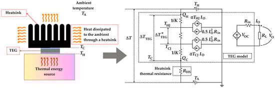 which is connected in series with the TEG model in Figure 4, as illustrated in Figure 7. A new gradient of temperature is defined herein: ΔT, which is the temperature difference between the heat source and the ambient (i.e., ΔT = TH − TA). In order to have TC as close as possible to TA and, hence, increase the output power, RTC should be much lower than the other resistances involved in the thermoelectric circuit. To do that, high values of h and/or A are required, which can be obtained using a heatsink attached to the cold side of the TEG [49], as explained next.