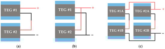 Electrical configuration of TEGs: (a) in series, (b) parallel, and (c) series–parallel.