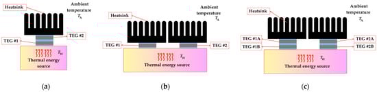Thermal configuration of TEGs: (a) in series, (b) parallel, and (c) series–parallel.