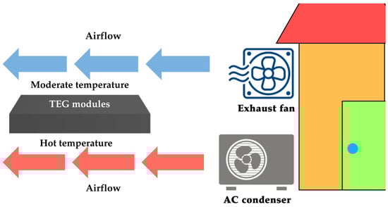 Another subgroup is related to air conditioning (AC) systems [60,61,62,63]. In [60], a simulation-based study was conducted, where several TEGs connected electrically in series were arranged on a 400 × 400 mm2 flat plate. The size of each TEG was not reported; however, assuming a typical area of 40 × 40 mm2, the number of TEGs on the plate would be 100. In the simulations, each TEG module was heated on the hot side by the hot airflow from an AC condenser (i.e., the external unit of the AC system), while the cold side was cooled by an exhaust fan airflow whose temperature was lower than that from the condenser, as illustrated in Figure 12. The proposed system, thanks to the huge number of TEGs employed, was capable of generating up to 90 W of electrical output power when the space cooling load of the AC was set to 100 kW.