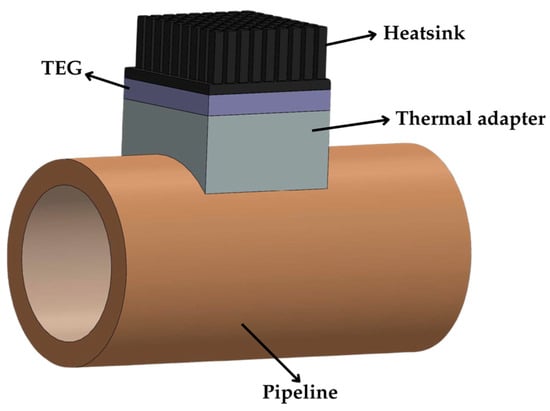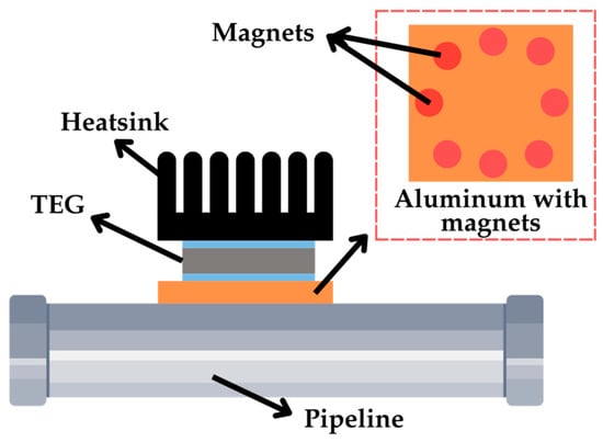 Water pipelines can also be potential heat sources for TEG applications, as investigated in [64,65,66]. A thermal adapter plate is typically used to address the mechanical mismatch between the TEG and pipeline surfaces, as shown in Figure 13. In [64], both hot and cold water indoor pipelines were studied, creating positive or negative thermal gradients with respect to the ambient. With ΔT = ±7 °C, an array of 48 TEGs, connected electrically in series and thermally in parallel with one heatsink for each two TEGs, generated VOC = 10 V and PMPP = 30 mW under no-wind conditions. Under slow wind conditions (1 m/s), VOC and PMPP increased by a factor of 2 and 4, respectively, in agreement with Equations (19) and (22).