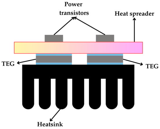 An alternative household appliance is the power amplifier usually found in audio systems, as discussed in [69]. The heat from the output transistors was leveraged using an aluminum plate as a heat spreader and transferred to the TEGs with a heatsink at the cold side, as illustrated in Figure 14. When the amplifier operated at 50 W, a single TEG provided ΔTTEG = 30 °C and PMPP = 293 mW. On the other hand, for two TEGs thermally in series, ΔTTEG = 50 °C and PMPP = 387 mW, and for two TEGs thermally in parallel, ΔTTEG = 17.5 °C and PMPP = 136 mW. The largest temperature gradient was achieved when the TEGs were connected thermally in series due to the increased thermal resistance. A lower ΔTTEG was observed when the TEGs were thermally connected in parallel because of the reduction in the overall thermal resistance of the TEG combination. An improvement of the previous application was carried out in [73].