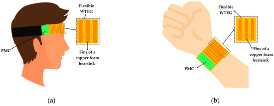 In [68], a flexible, custom-designed TEG was developed to extract thermal energy from an electric thermos pot. The TEG was placed between two copper plates, and a flexible passive heatsink was used. When the water inside the thermos pot was boiled and maintained at 95 °C, the resulting ΔTTEG exceeded 5 °C, thus resulting in VOC = 0.11 V and PMPP = 0.8 mW.