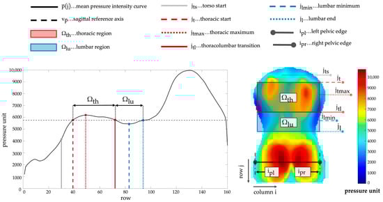 Figure 1. Mean pressure intensity curve p ¯ ( j ) and region of interest I ROI ( j , i ) (including pressure scale) with marked thoracic region Ω th and lumbar region Ω lu as well as the landmarks utilized during parameter extraction.