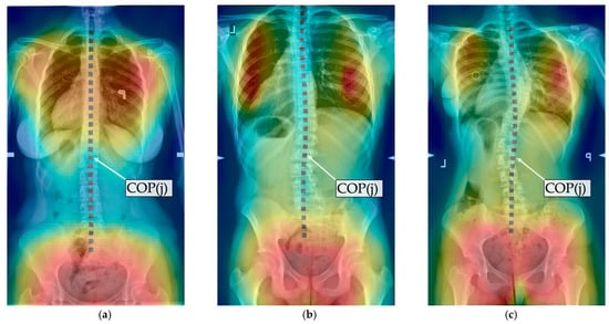 The radiologically obtained Cobb angle is calculated as the angle between tangents of the upper and lower end plate of the vertebrae with the highest tilt above and below the spine’s curvature apex, respectively [11]. The center of pressure curve COP ( j ) is comparable to the spinal curve observed in the X-ray (cf. Figure 2) and can be reliably extracted [35]. Therefore, this work utilized COP ( j ) as an approximation of the frontal spinal curve. In correspondence with the Cobb angle calculation, curvature angles were determined based on the COP ( j ) curve.